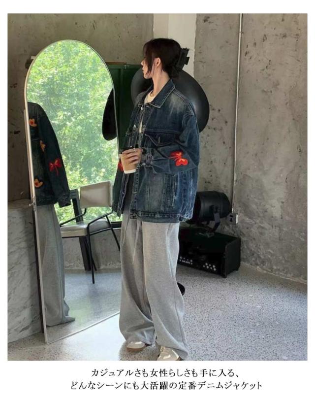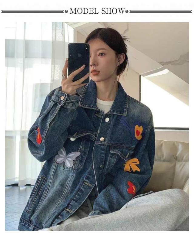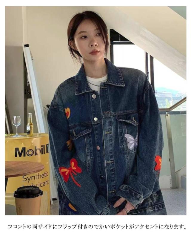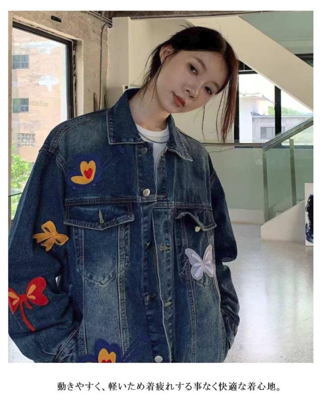 ジャケット デニムジャケット 春 デニムジャケット 刺繍 カジュアル レディース 襟付き ジャケット Gジャン 蝶 レトロ アウター アメリカン カジュアルウェア ゆったり フィット ヴィンテージ感 春 デニムコート 秋 おしゃれ ファッション お出かけ 通勤 通学