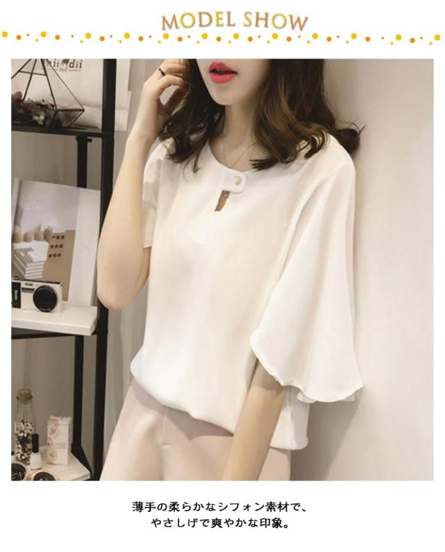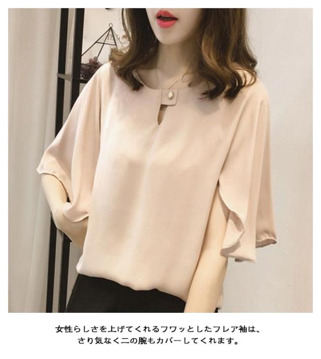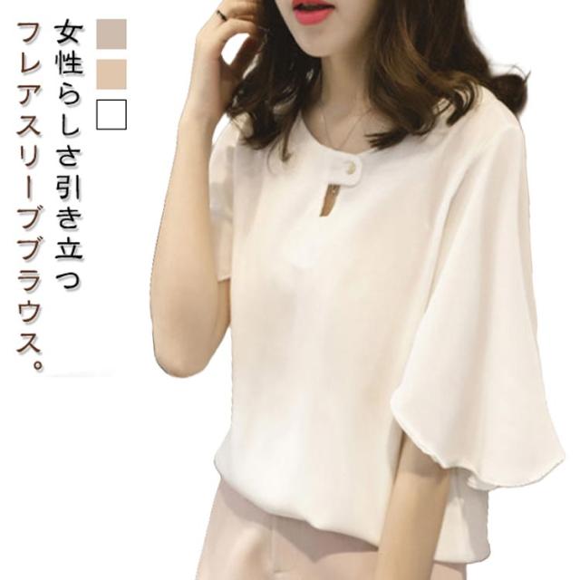 フレアスリーブ ブラウス レディース ブラウス カットソー フレア袖 シャツブラウス フレアスリーブ シフォン 半袖 きれいめ フリルブラウス シャツブラウス フェミニン 送料無料 薄手 ゆったり 体型カバー ブラウス ホワイト グレー ピンク きれいめ オフィス