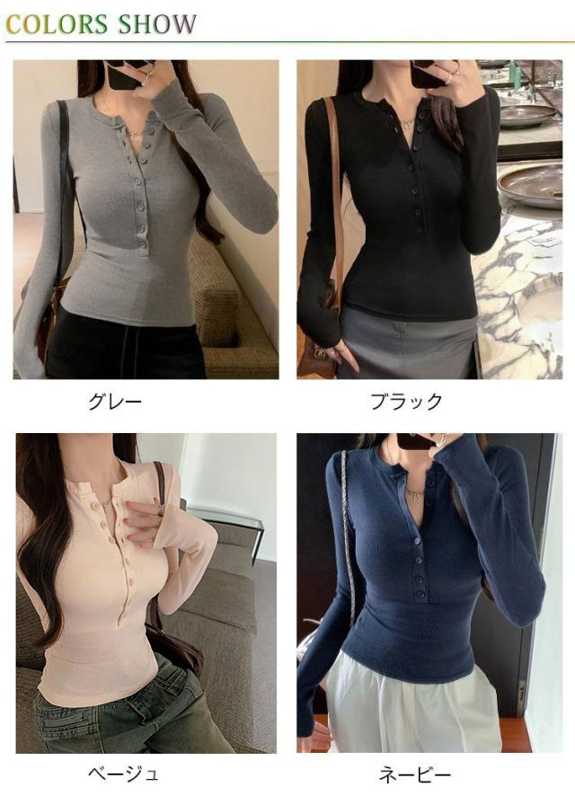 | の無地長袖tシャツ。 体に優しくフィットし、美ボディライン。 フロントについているボタンの開け閉めでセクシーさを調整できます。 薄手の伸縮性のある生地でタイトなのに窮屈感も感じません。 | |