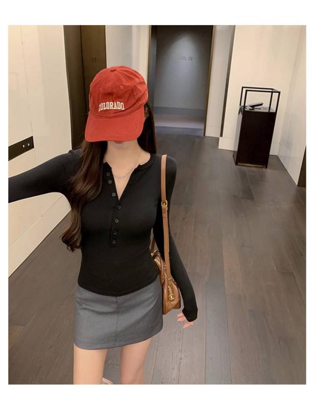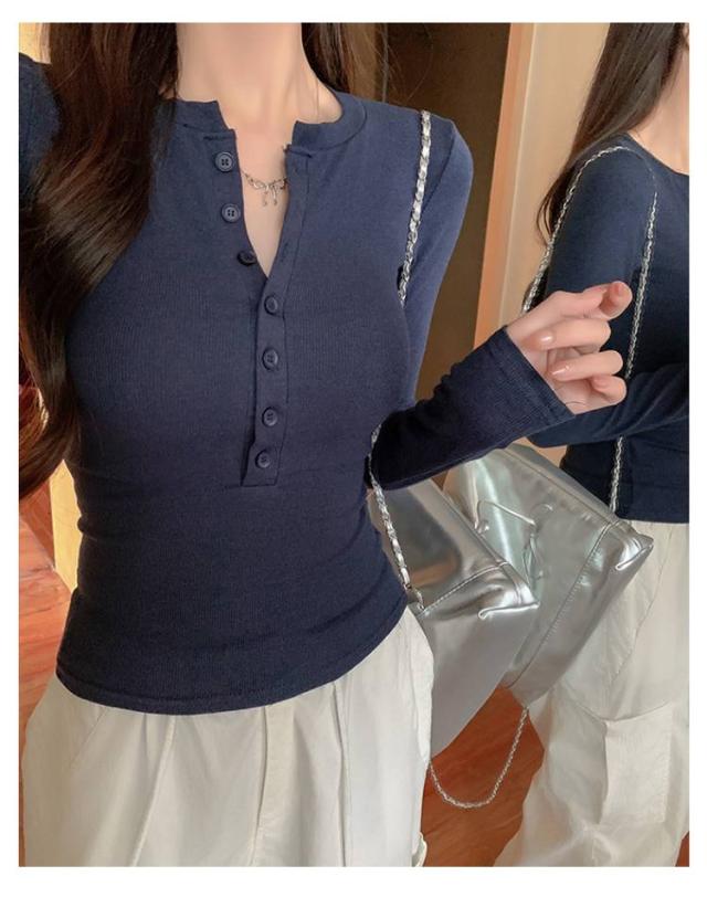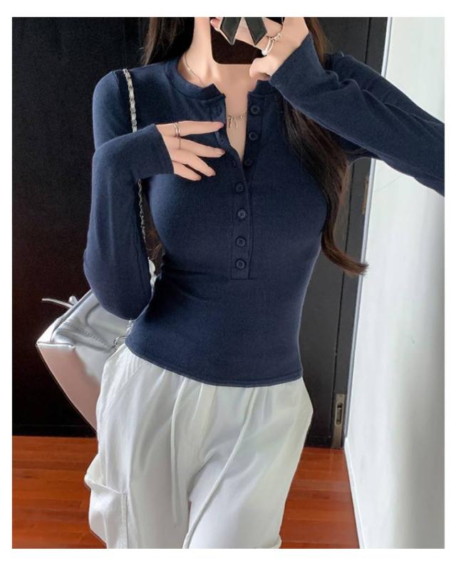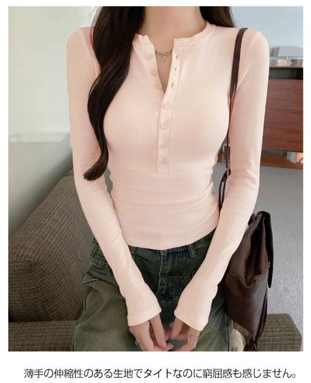 長袖tシャツ レディース 薄手 カットソー ヘンリーネック ロンT 春服 長袖カットソー おしゃれ かわいい シンプル タイト 無地 ボタン ストレッチ スリム カジュアル 春 秋 冬 送料無料