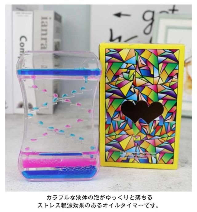 | リラックス効果のある2色のオイルタイマー カラフルな液体の泡がゆっくりと落ちるストレス軽減効果のあるオイルタイマーです。 カラフルな油滴で鑑賞をもっと楽しく 綺麗で様々な色の油滴が落ちるので、インテリアやおもちゃとしてのお子様へのプレゼントに最適です。 | |