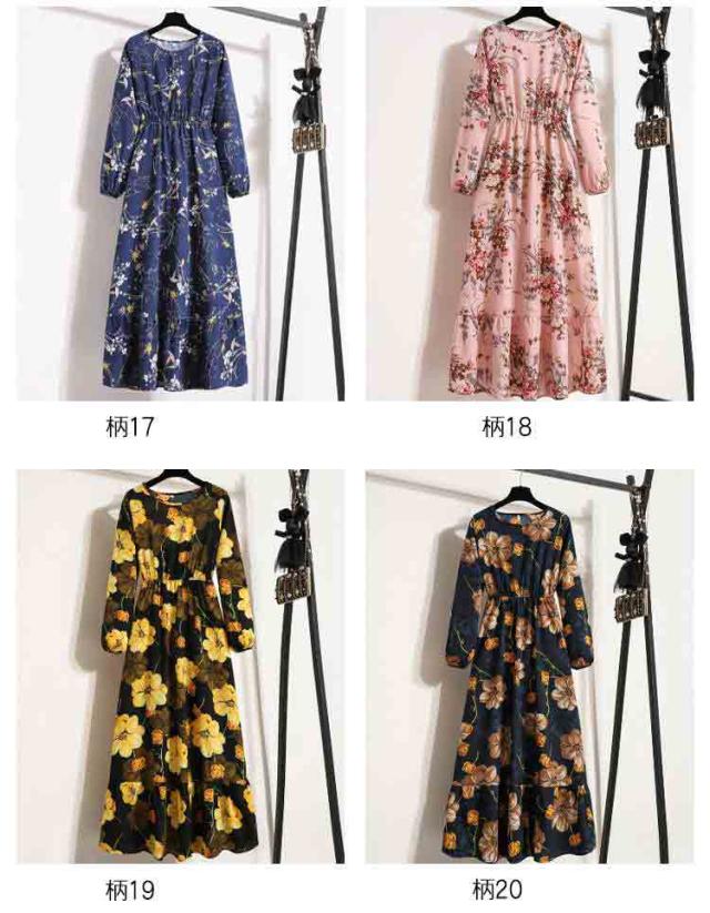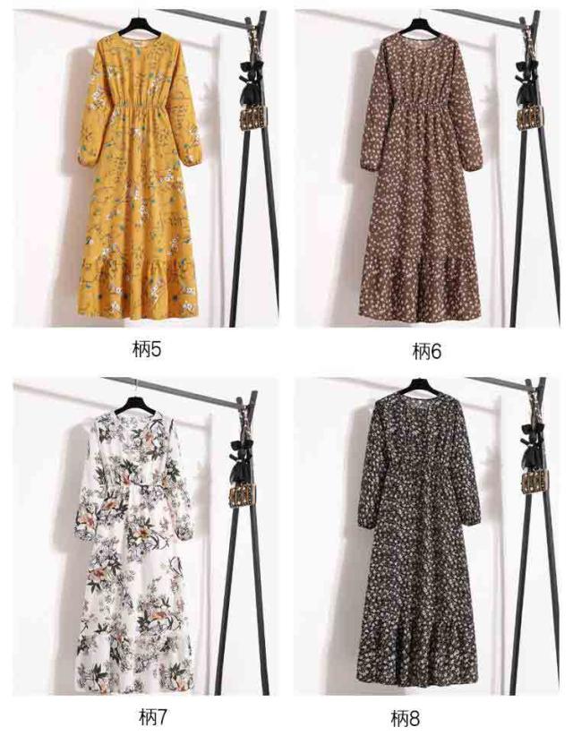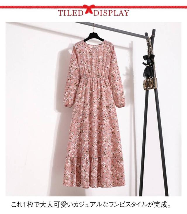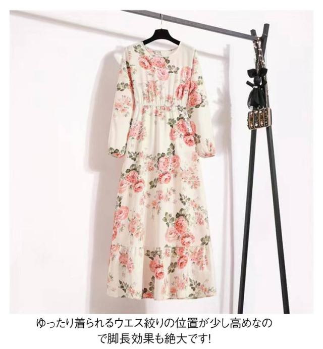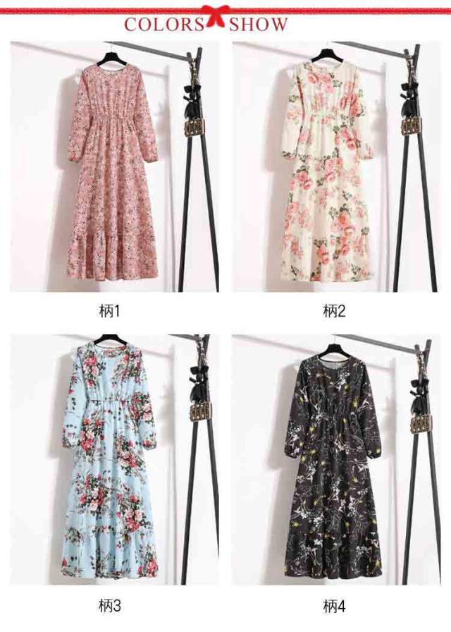 ロング ロングワンピース スリム効果 ワンピース フラワープリント 長袖 レディース 春服 ウエスト絞り シフォン フラワープリント ロングワンピ 花柄 かわいい フレア 女子会 デート 送料無料