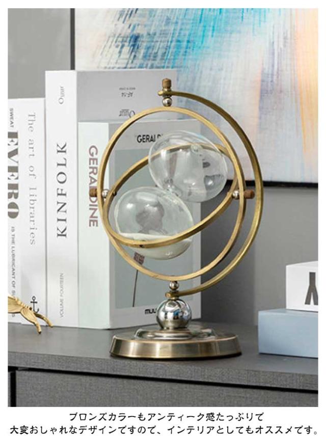 | ヨーロピアンアンティーク風のとってもオシャレで素敵な回転式砂時計です。 まるで地球儀のデザインのように回転することが出来るとても珍しいデザインです。 角度を720度簡単に調整でき、気分をリラックスさせ、作業圧を和らげることができます。 60 分間の砂タイマーを反転させることで、60分間の途切れのないワークフローを実現し、集中力を維持し、生産性を向上させます。 ブロンズカラーもアンティーク感たっぷりで大変おしゃれなデザインですので、インテリアとしてもオススメです。 デジタルな世の中ですが、アナログなアイテムでゆったり時間を計るのもステキですね。 | |