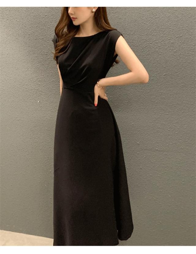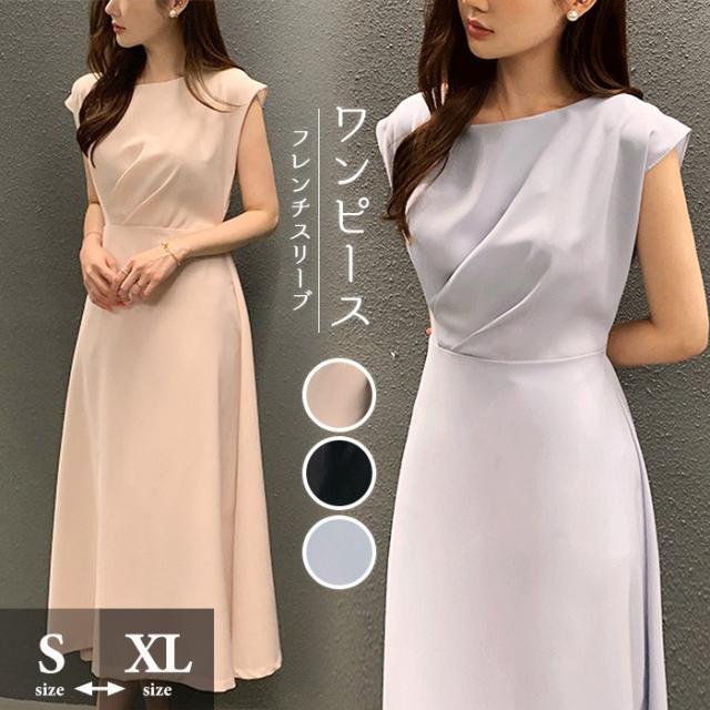 ワンピース レディース 春 きれいめ お呼ばれ おしゃれ 夏 パーティー ドレス 大人 黒 ブラック フレンチ袖 フレンチスリーブ 袖あり ミモレ丈 タレ感 無地 シンプル カジュアル 春夏 ゆったり 通勤 OL オフィス ビジネス