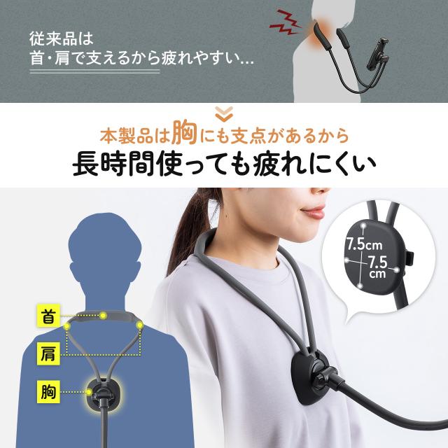 ●スマートフォンの重量を胸の支点で支える構造のため、首や肩にかかる負担を軽減します。