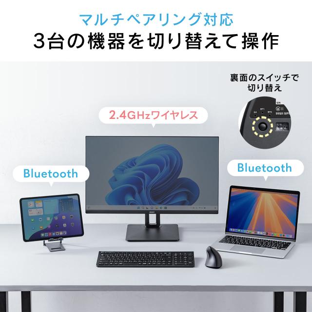 ●合計3台のマルチペアリングに対応し、USB Aレシーバー×1台、Bluetooth×2台の接続を切り替えて使えます。