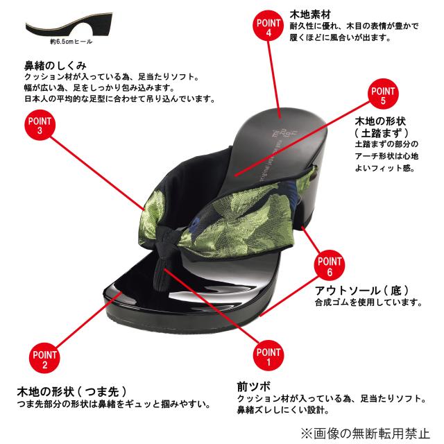 足裏にフィットするように施されたオリジナルの彫りと、クッション性のある鼻緒による履き心地の良さを実現した、浴衣や着物はもちろんお洋服にも似合うシンプルなデザイン。日本の伝統的なカタチがモダンな雰囲気を演出。