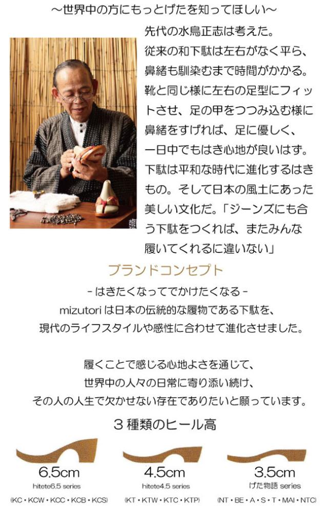 現代のファッション、ライフスタイルに合う、豊富なデザインにより、従来の下駄の概念を覆し、進化した下駄を発信するブランドmizutori。