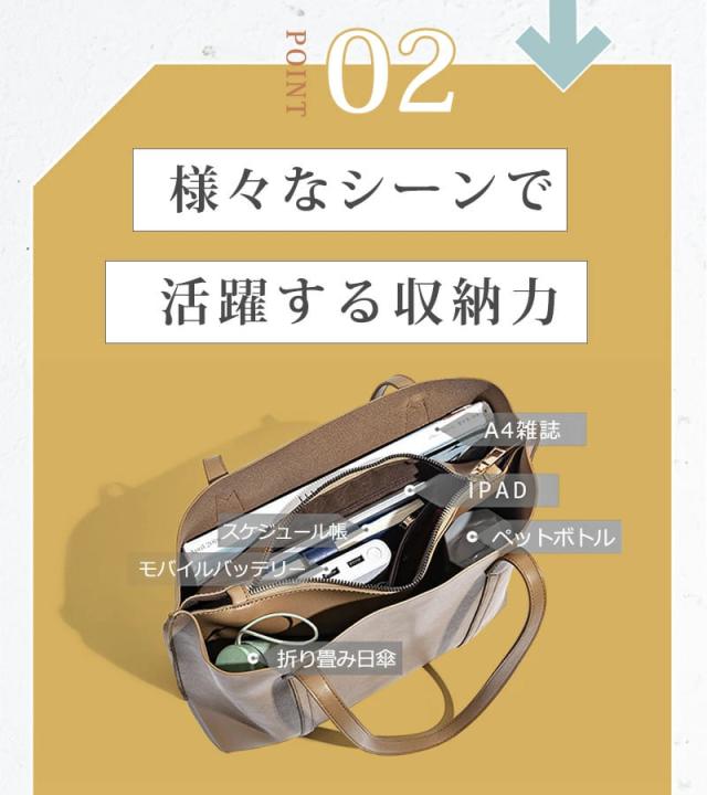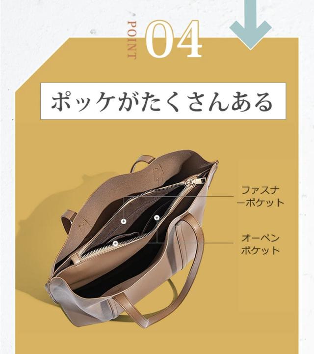 ●【中身のファスナーポケット】中身にはファスナーポケットが付いているので、「仕事柄バッグの口を閉じなければならない」、「バッグの中を見られたくない」などの悩みも解決します。