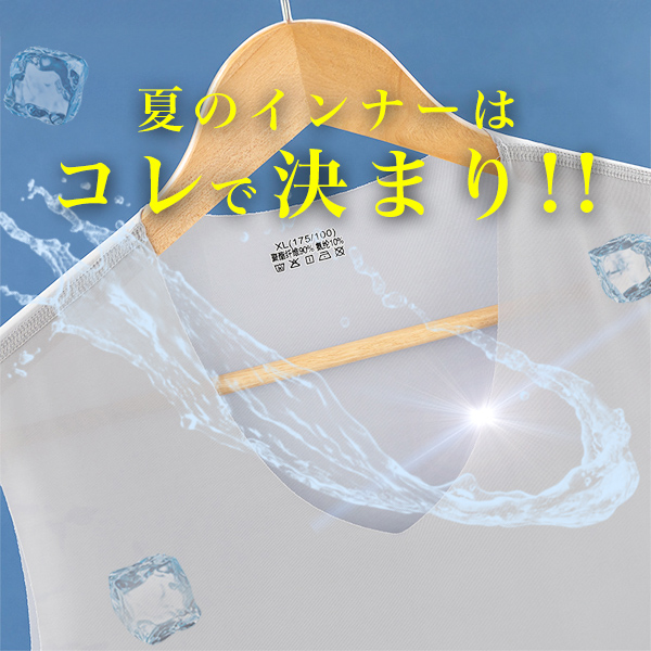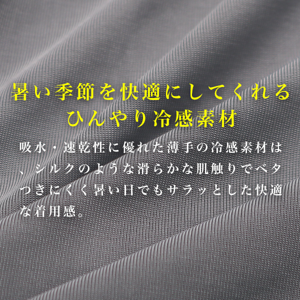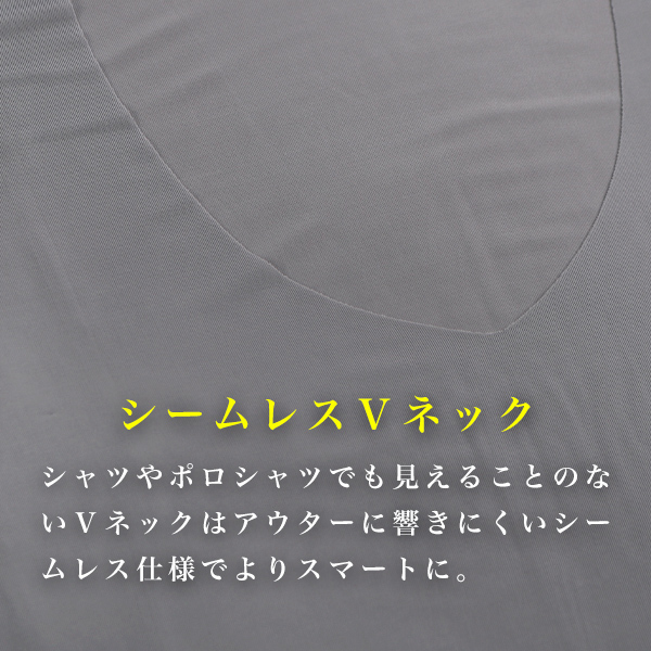 | [商品説明] | <暑い季節を快適にしてくれるひんやり冷感素材> 吸水・速乾性に優れた薄手の冷感素材は、シルクのような滑らかな肌触りでベタつきにくく暑い日でもサラッとした快適な着用感。 <シームレスVネック> シャツやポロシャツでも見えることのないVネックはアウターに響きにくいシームレス仕様でよりスマートに。 |