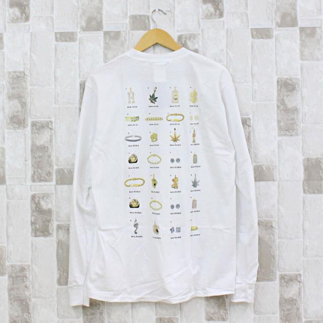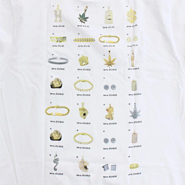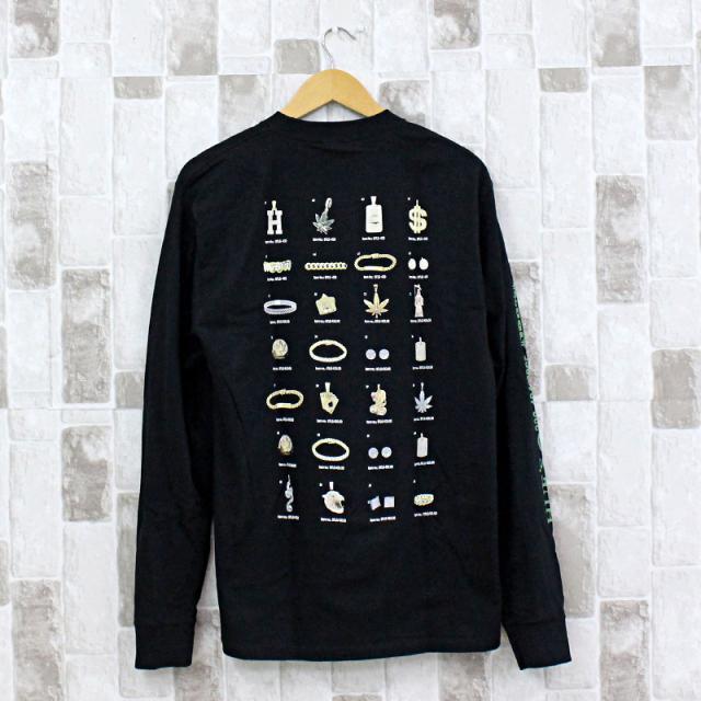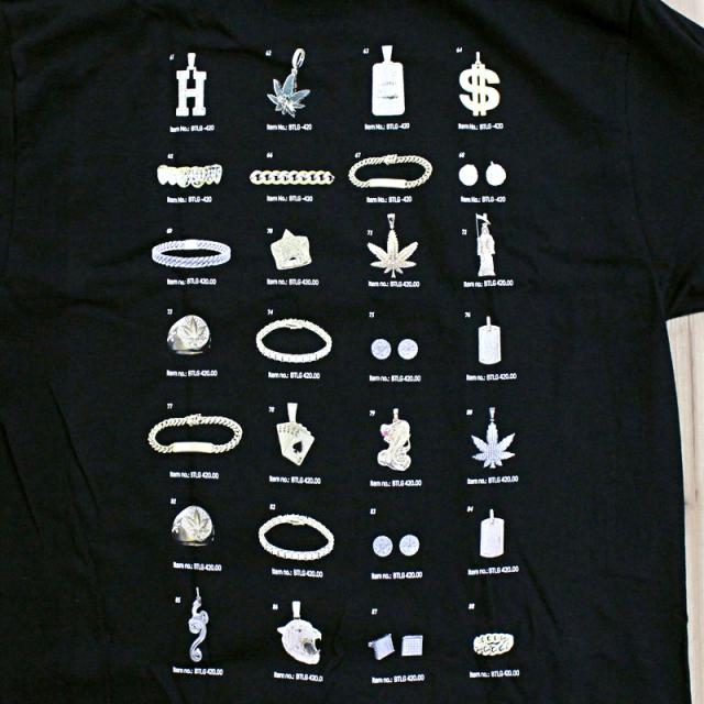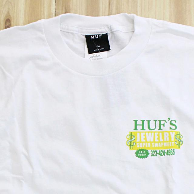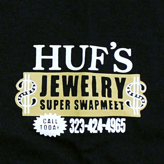 HUFジュエリーがカタログの様に並べられたバックプリント、フロントのワンポイント、