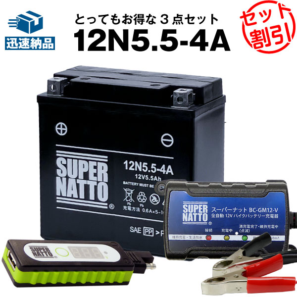 バイクでスマホ充電 USBチャージャー+充電器+12N5.5-4A セット■バイクバッテリー■12N5.5-4A、Y12N5.5-4A、R12N5.5-4A互換 スーパーナット充電器(12V) 送料無料