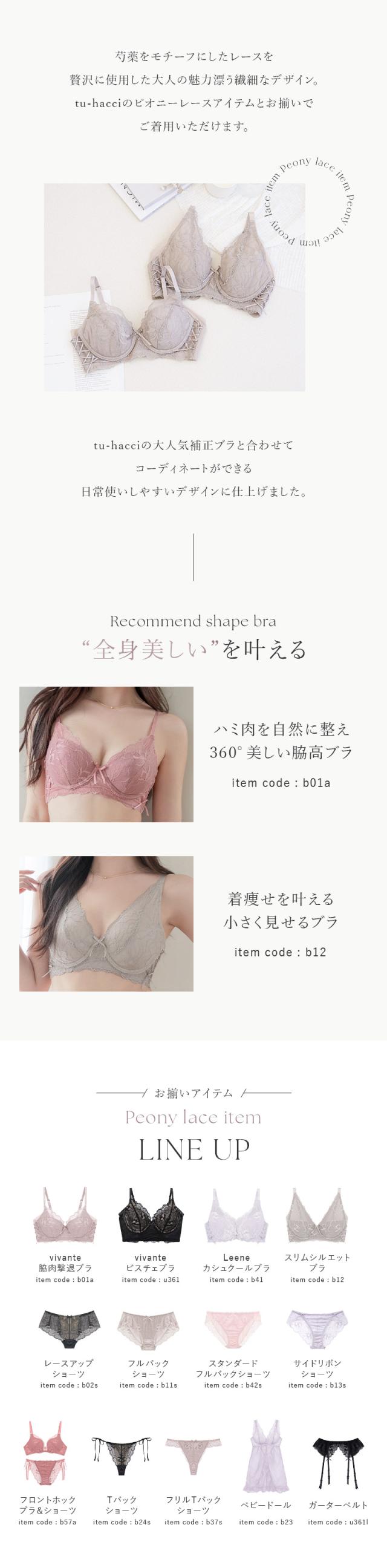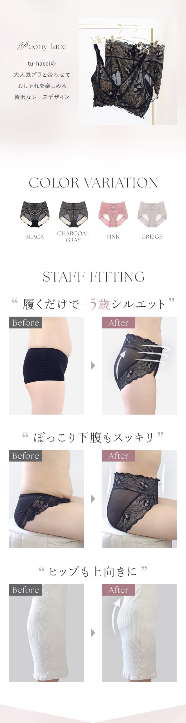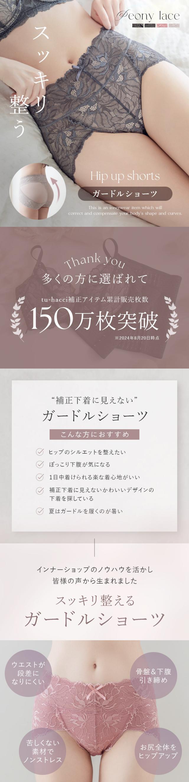 tu-hacci Shorts Collection ショーツ単品 『ヒップアップ』『骨盤ケア』などの機能で、忙しい毎日を快適にサポート。 365日いつでもお洒落な自分でいたい。 ガードルを履く日もお気に入りの下着とコーディネートを楽しみたい。 そんな方に向けた「補正下着に見えない」ヒップアップショーツ。 特別な日はもちろん、日常使いにもおすすめの一着。 ■スタイルアップを叶える機能 ・履くだけでお尻・骨盤・下腹を手軽に補正。 ・ストレッチ素材でお尻全体を包み、美しいヒップラインをキープ。 ・ショーツの上に乗りがちなぜい肉もしっかりカバーし、段差レスに。 ・パワーネットが骨盤を心地よく引き締め、ノンストレスな着用感。 ・通気性が良いレース生地で、汗をかいても蒸れにくく1日中快適。 ・苦しくないから、毎日続けやすい快適設計。 ■気分によって使い分け可能 レース生地は当店の補正ブラで一番人気のVivanteシリーズと同じ「ピオニーレース」を採用。 芍薬をモチーフにしたレースを贅沢に使用した大人の魅力漂う繊細なデザイン。 ピオニーレースのブラをお持ちの場合、 その日の気分や服装に合わせてコーディネート可能。 ≫ミドル丈はこちら≪ ≫ ギフトラッピングはこちら ≪ | |
