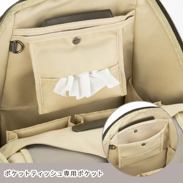 ポケットティッシュ専用ポケット。ティッシュの向こう側にはビニール素材でお手入れ可能な簡易ゴミスペースとマルチポケット付き。