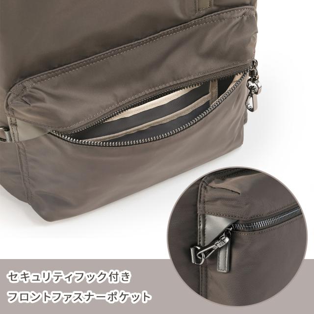 セキュリティフック付きのフロントポケット。内側にはポケットが3つ。