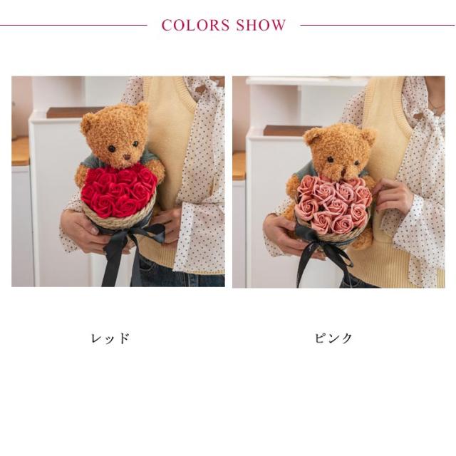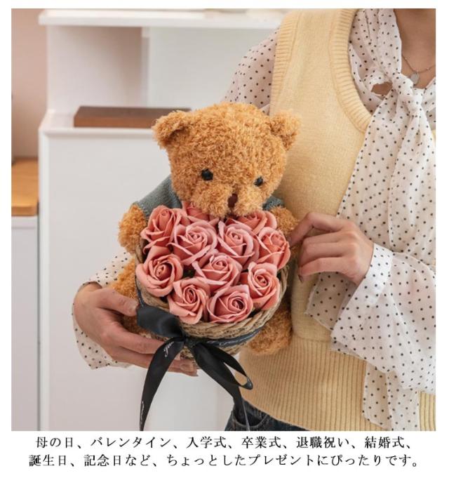| 見てて思わず、笑顔になってしまう癒し満点なおぬいぐるみローズブーケです。【メッセージカード、ギフト袋、ledライト付き】 石?で作られているお花です。 石けんのいい匂いがふんわりと香るので人気があります。大切な人へのプレゼントへぴったり! 生花のように水やりやお手入れの必要がなく、枯れる心配も虫や花粉の心配もありません。 ふわふわの愛らしいベアがどんな素敵なシーンも可愛く華やかに彩ります 大事な記念日にプレゼントとしてそのままお渡しすることも可能です。玄関やお部屋にそのまま飾って頂くだけで、ほのかな香りが楽しめるインテリアや飾りになるおしゃれな芳香剤として女性にも男性にも喜ばれるフラワーギフトです。 母の日、バレンタイン、入学式、卒業式、退職祝い、結婚式、誕生日、記念日など、ちょっとしたプレゼントにぴったりです。 【手提げ袋付き】おしゃれな手提げ袋付きです。袋に入れると送った相手も持ち運びに便利です。 | |