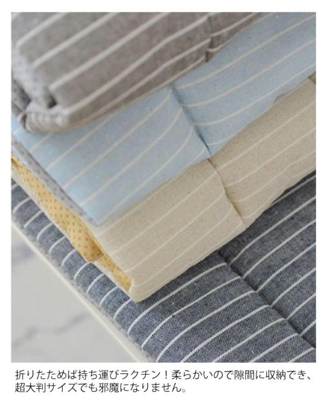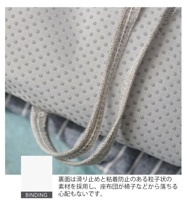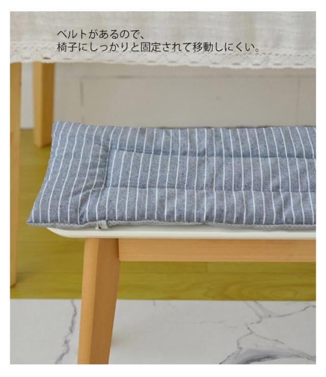 | インテリアに馴染みやすい、オールシーズン使えられるベンチクッション 厚みのあるクッションで座る時に、体圧を分散して身体を柔らかく支えることができ、長時間の座り作業でもお尻は疲れません。 裏面は滑り止めと粘着防止のある粒子状の素材を採用し、座布団が椅子などから落ちる心配もないです。 ベルトがあるので、椅子にしっかりと固定されて移動しにくい。 折りたためば持ち運びラクチン!柔らかいので隙間に収納でき、超大判サイズでも邪魔になりません。 周りの家具とバランス良く馴染んでいます。部屋の模様替えやインテリア飾りとしてぴったり。 | |