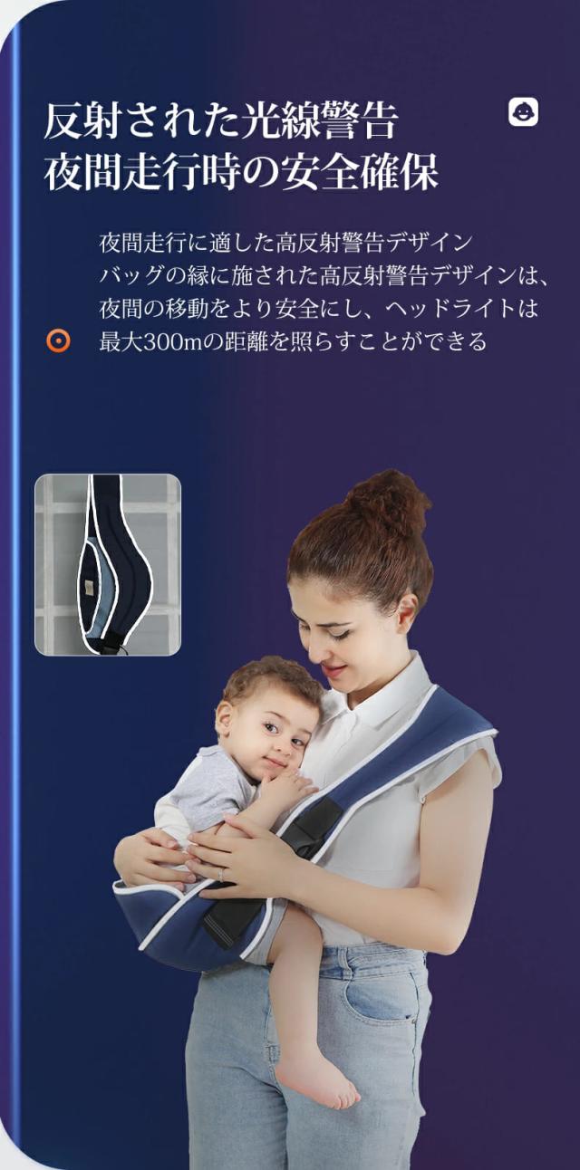 ●【ハイライト反射エッジ設計】携帯型抱っこ紐ベビースリングはハイライト反射エッジ設計を採用し、エッジ設計にはハイライト反射警告があり、ランプの照明距離は300メートルに達することができ、安全発光警告、目立つことができ、母子は夜間安全である。
