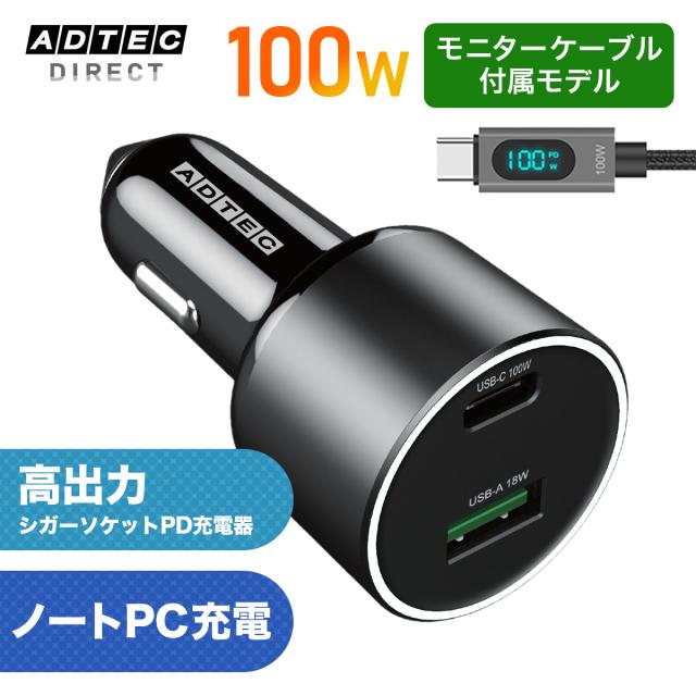 車載充電器 100W PD USB-C Wモニターケーブル付 高出力 ノートPC MacBook対応 急速充電 12V 24V対応 USB-A シガーソケット 営業車 長距離ドライバー 日本メーカー