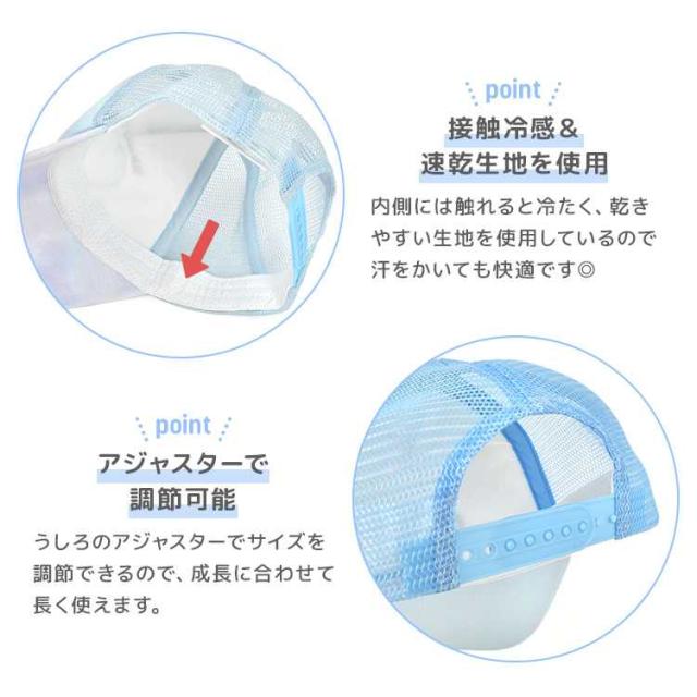 サンリオキャラクターのデザインがかわいいキッズサイズのメッシュキャップ。通気性抜群のメッシュ素材なので暑い季節にぴったり!内側には接触冷感&速乾生地を使用しているので触れるとひんやり、汗で濡れても乾きやすい◎アジャスター付きでサイズ調整も可能です。