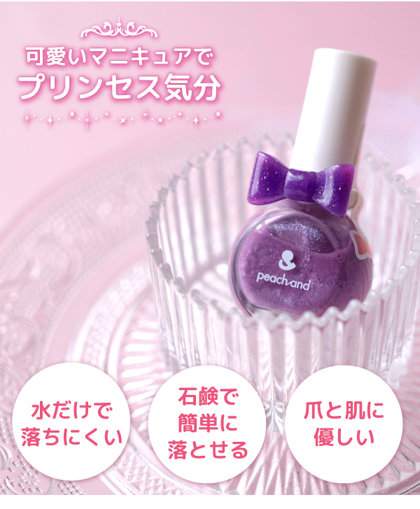 石鹸で落ちるから、お子さまにも安心して使える水ベースのマニキュアです。
