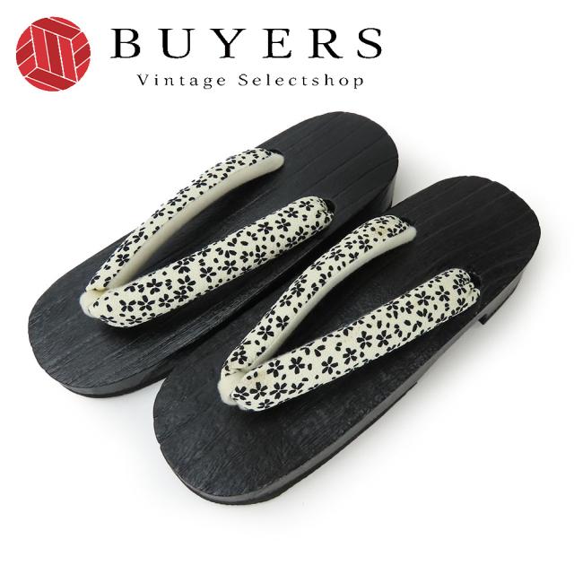 中古 下駄 未使用展示品 フリーサイズ ポリエステル 桐 黒 白 浴衣用 小花柄 モノトーン 和装 呉服 和服 きもの レディース 女性