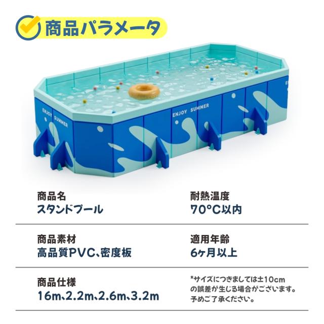 | 【商品説明】 | カラー:ブルー/ピンク 素材: 100% PVC セット内容:プール本体*1 【サイズ】 1.6M:外寸:160*120*47cm 内寸:130*90*47 適用人数:1-2人 2.2M:外寸:220*145*55cm 内寸:190*115*47 適用人数:1-4人 2.6M:外寸:260*165*55cm 内寸:223*135*55 適用人数:1-6人 3.2M:外寸:320*185*55cm 内寸:280*150*55cm 適用人数:1-8人 4.2M:外寸:420*195*55cm 内寸:350*165*55cm 適用人数:1-12人