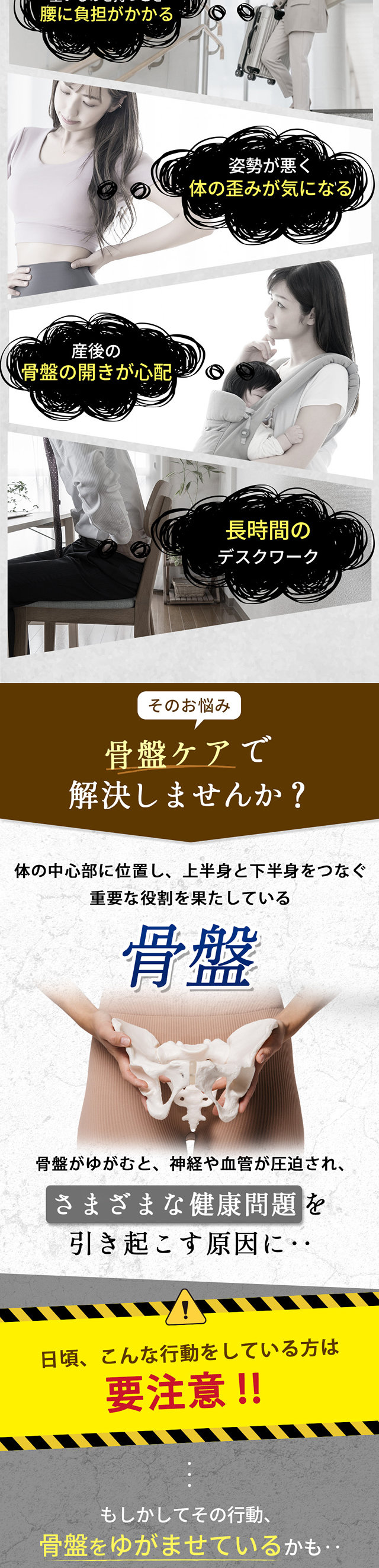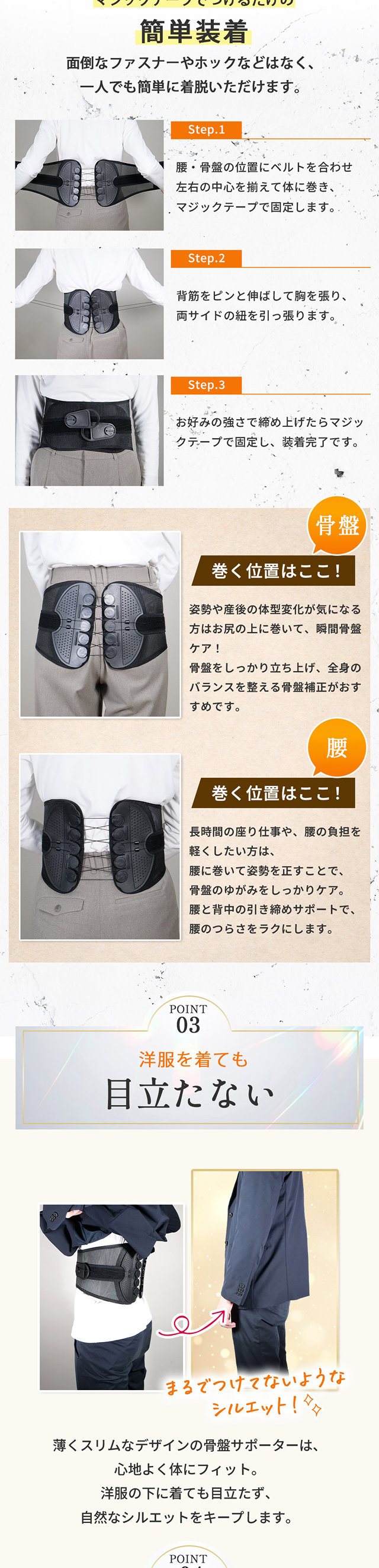 ぐ〜っと腰が伸びるつけ心地がクセになる骨盤ベルト。つけるだけで骨盤を立ち上げ、骨盤のゆがみをしっかりケア。