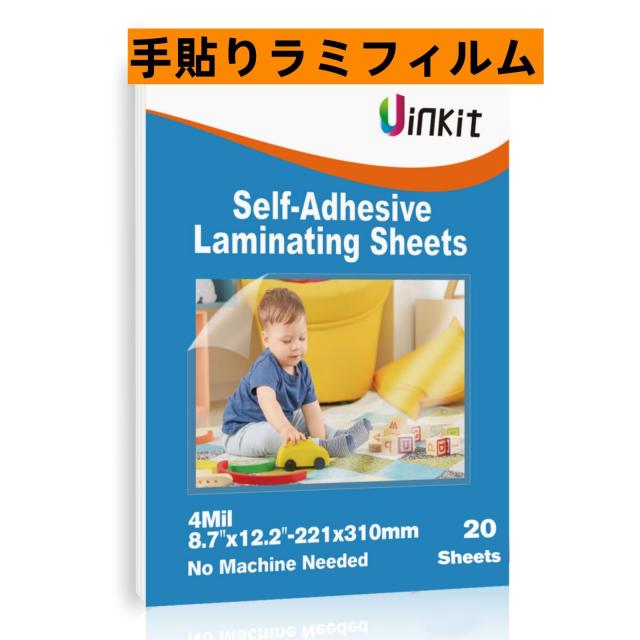 Uinkit 独自接着カバーフィルム 100μm A4サイズ、20枚入 機械不要、その場で簡単ラミネート 手貼りラミフィルム, ラミネートフィルム、