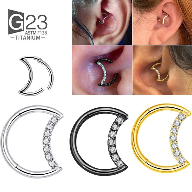 [16G チタングレード23 ボディピアス] G23チタン製ジルコニアムーンクリッカー 16ゲージ セグメント コンク ダイス ロック 軟骨 耳 鼻シルバー 銀色 金色 ゴールド 黒色 ブラック 石付き クリスタル ジュエル キラキラ メンズ レディース リング型 三日月
