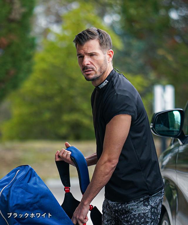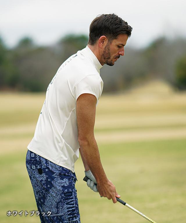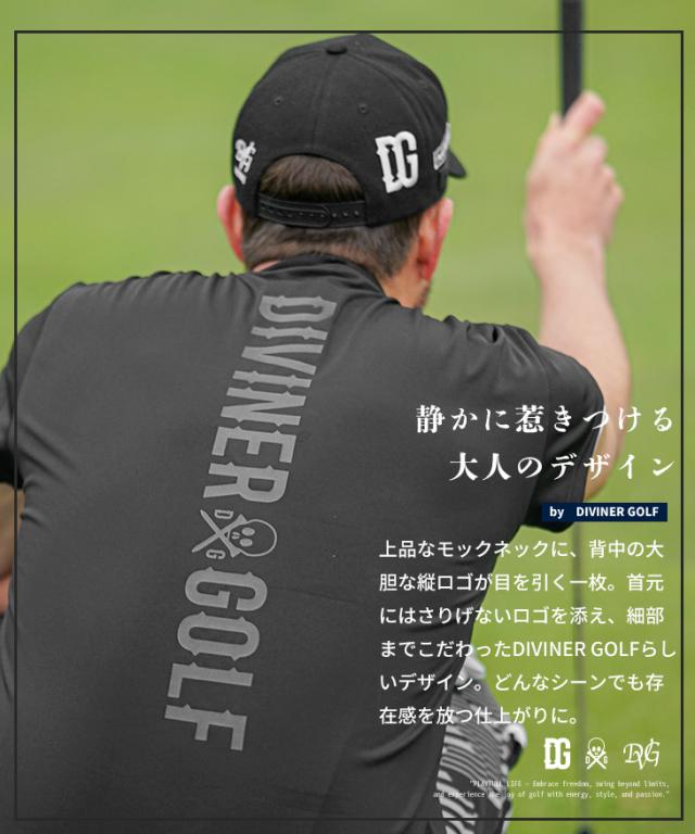 DIVINER GOLF(ディバイナーゴルフ)『攻め袖モックネック』【ストレッチモックネックショートスリーブ】■Design/デザインDIVINER GOLFが提案するのは、ルールの“内側”で最大限に遊ぶスタイル。タンクトップNGなフィールドで、限界ギリギリを攻め抜く。それがこの“攻め袖”ショートスリーブモックネック。伸縮性抜群のポリエステル×ポリウレタン素材が、スイングを妨げないストレスフリーな着心地を実現。首元のロゴで品よくアピールしつつ、背中には大胆な縦ロゴをオン。プレイ中も、後ろ姿で語れるインパクトを。春夏の主役にふさわしく、攻めて、映える。誰よりも“自由”でいたいなら、この一枚を。