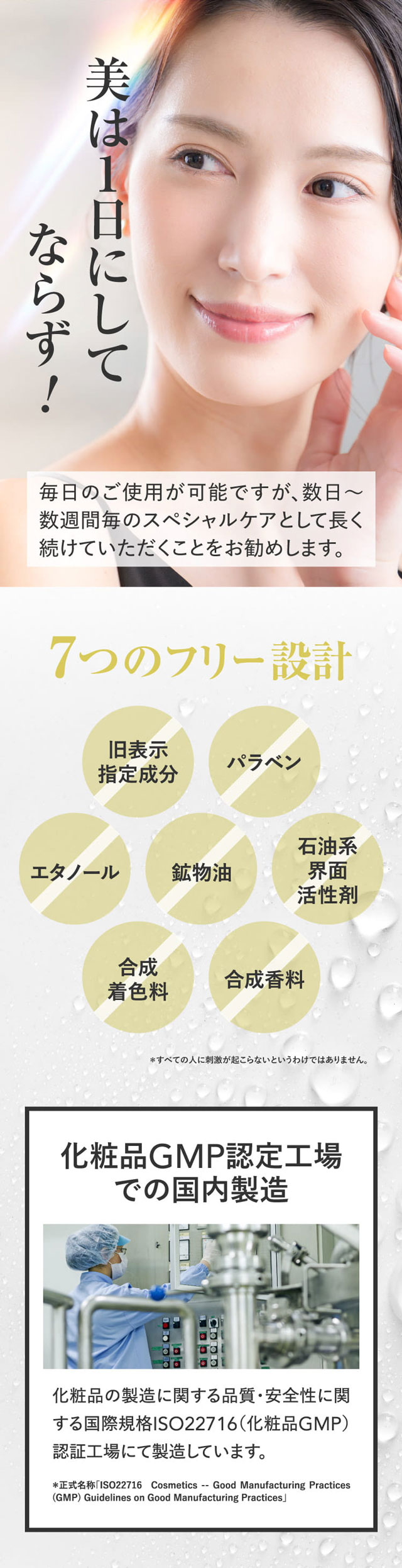 | 使用方法 | 洗顔後、化粧水などでお肌を整えます。 本品を手のひらに適量取り、顔全体または気になる部分を中心になじませてください。 |