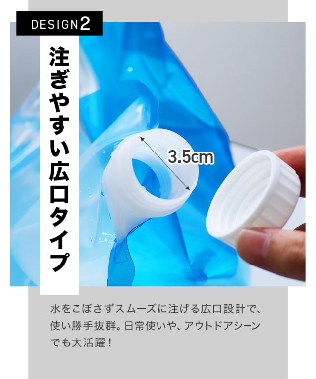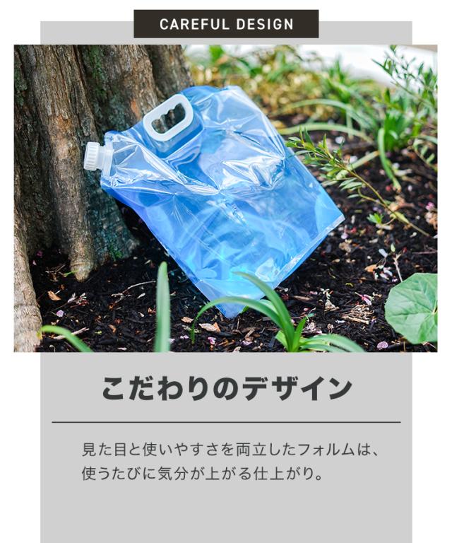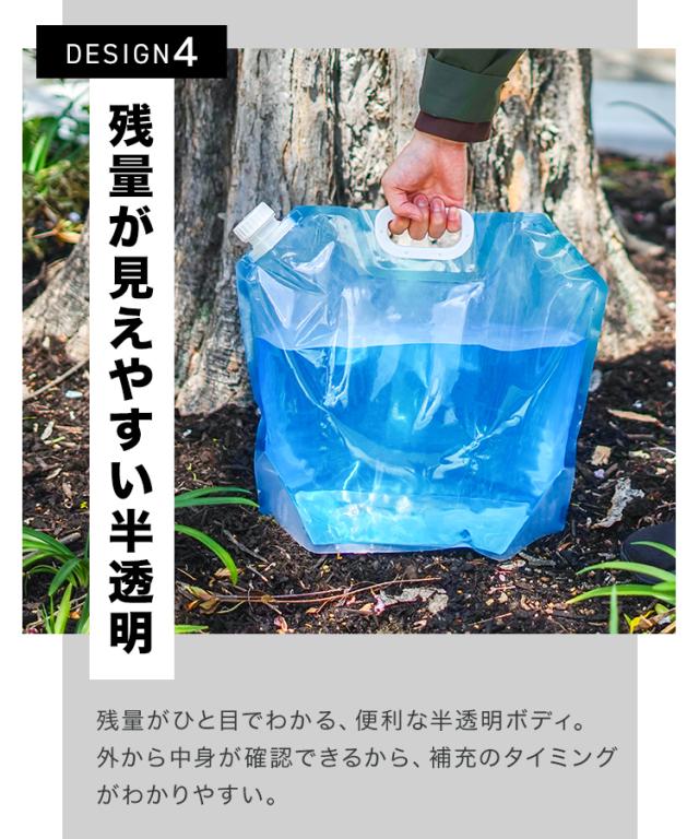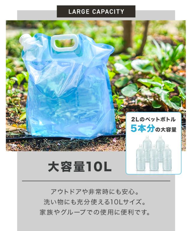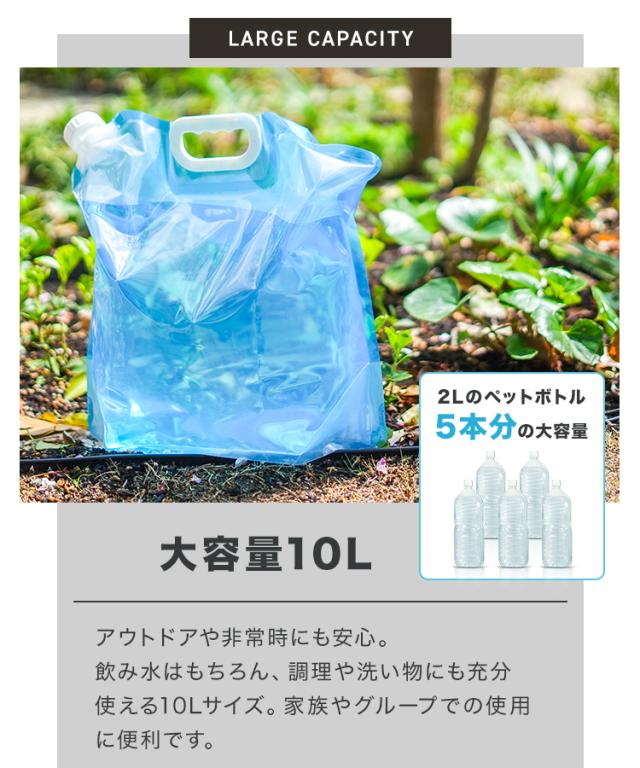 ・小さく畳めて、持ち運びに便利 ・大容量10L ・使いやすい持ち手付き ・注ぎやすい広めの注ぎ口 ・マチ付きで自立可能 ・片面クリア、液体の色、量の確認ができる |