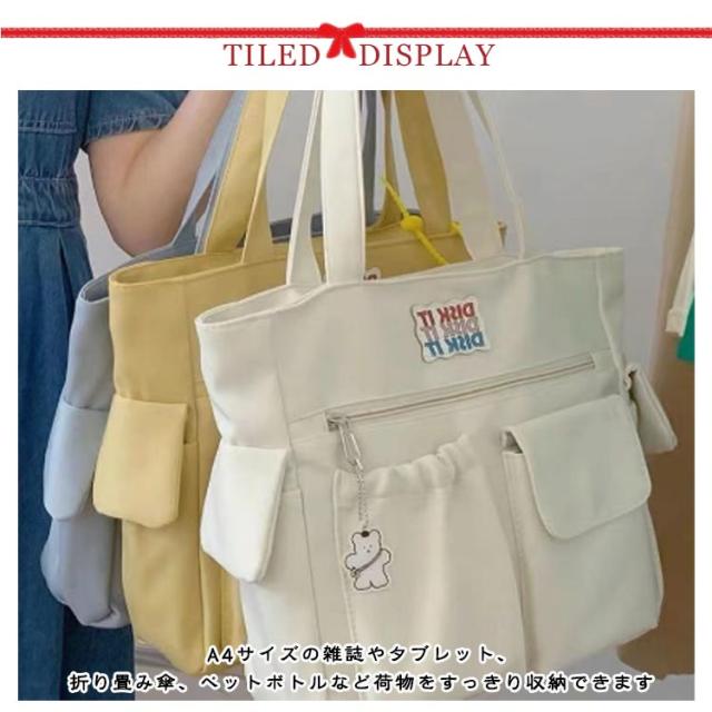 | ちょっとした旅行にも使える大容量のトートバッグが登場しました A4サイズの雑誌やタブレット、折り畳み傘、ペットボトルなど荷物をすっきり収納できます 持ち手幅が広く、重い荷物を入れても食い込みにくく、肩や腕に負担が少なくストレスフリー 通勤・通学・ジム用・ママバッグ・普段使いまで幅広いシーンでご利用できます。 | |