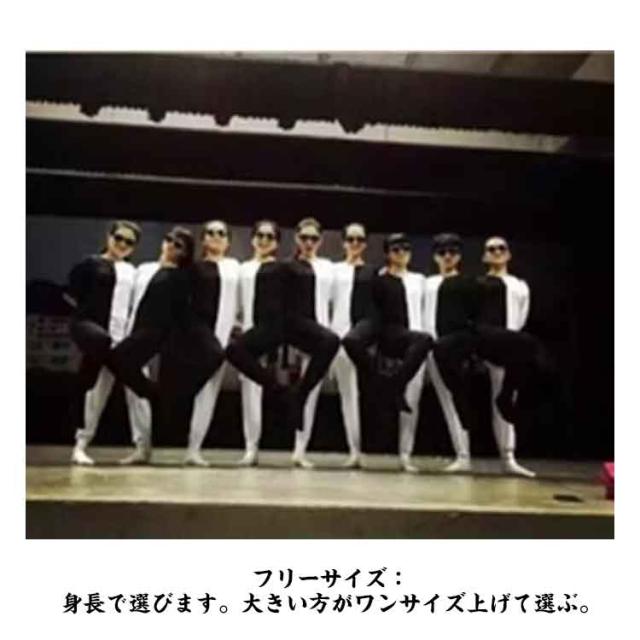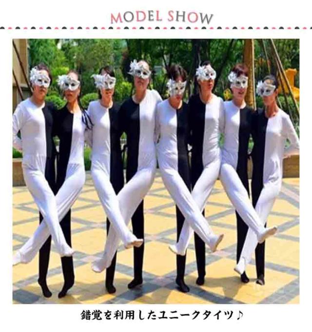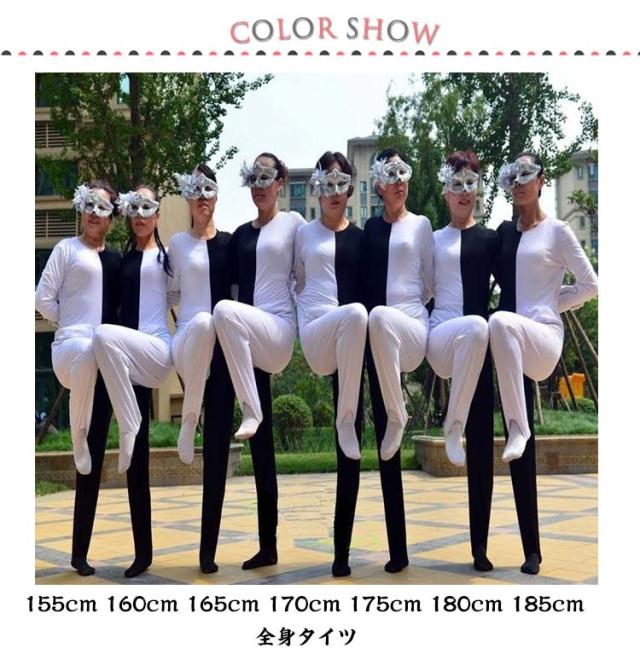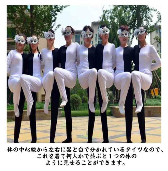 | 【錯覚ダンス衣装】 錯覚を利用したユニークタイツ♪ 体の中心線から左右に黒と白で分かれているタイツなので、これを着て何人かで並ぶと1つの体のように見せることができます。 例:「黒白タイツ」と「白黒タイツ」の人が隣同士にした場合など 左右異なる色を使った定番コスチュームの全身タイツです。 背中隠しファスナー、早着替えなどの演出時でもスムーズに着脱が可能なんです。 男女問わず着用できるよういろんなサイズをご用意しました。身長でサイズを選ばれて頂く。 フリーサイズ: 身長で選びます。大きい方がワンサイズ上げて選ぶ。 | |