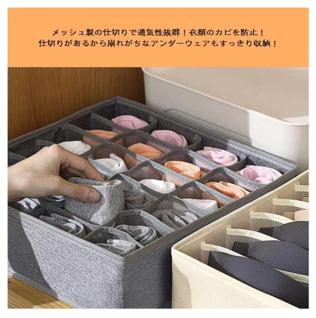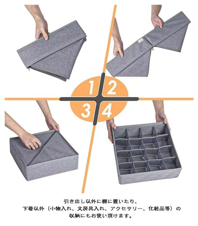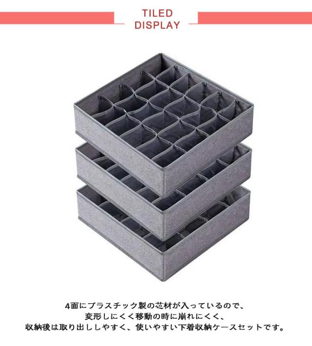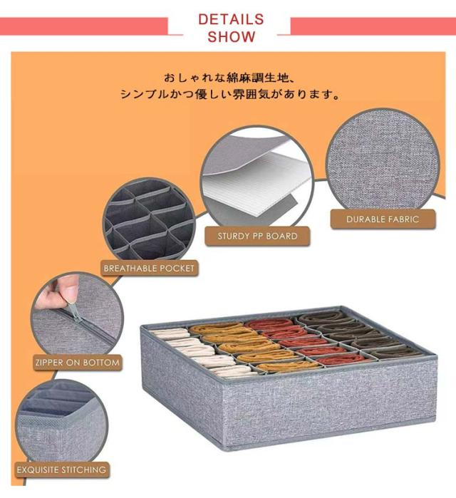 | 洗える下着収納ケース3点セット。 内部の芯材がプラスチックになっているため、汚れても水洗いできるから、清潔さとおしゃれをキープ。 4面にプラスチック製の芯材が入っているので、変形しにくく移動の時に崩れにくく、収納後は取り出ししやすく、使いやすい下着収納ケースセットです。 メッシュ製の仕切りで通気性抜群!衣類のカビを防止!仕切りがあるから崩れがちなアンダーウェアもすっきり収納! おしゃれな綿麻調生地、シンプルかつ優しい雰囲気があります。 使わないときは底のジッパーを開けて、畳ことができます。隙間などにもしまえるので。使わない場合でも邪魔になりません。 引き出し以外に棚に置いたり、下着以外(小物入れ、文房具入れ、アクセサリー、化粧品等)の収納にもお使い頂けます。 | |