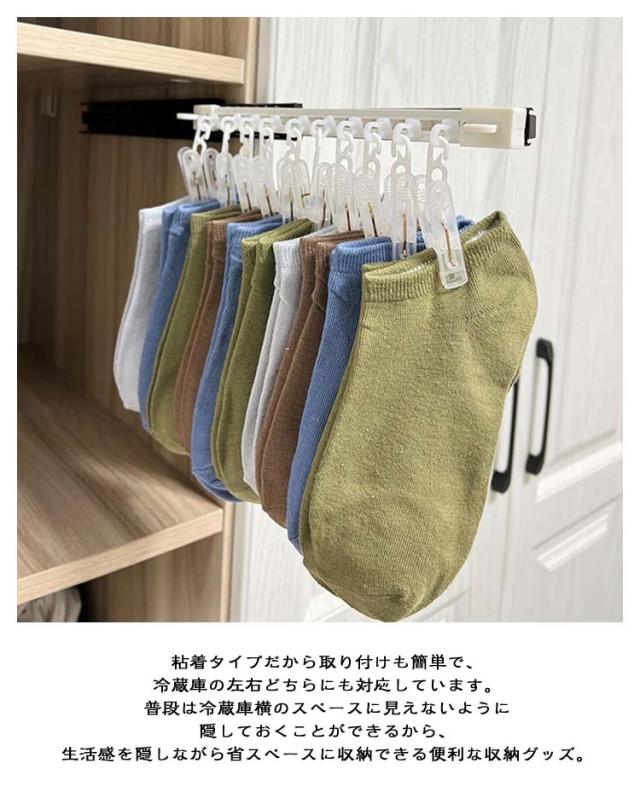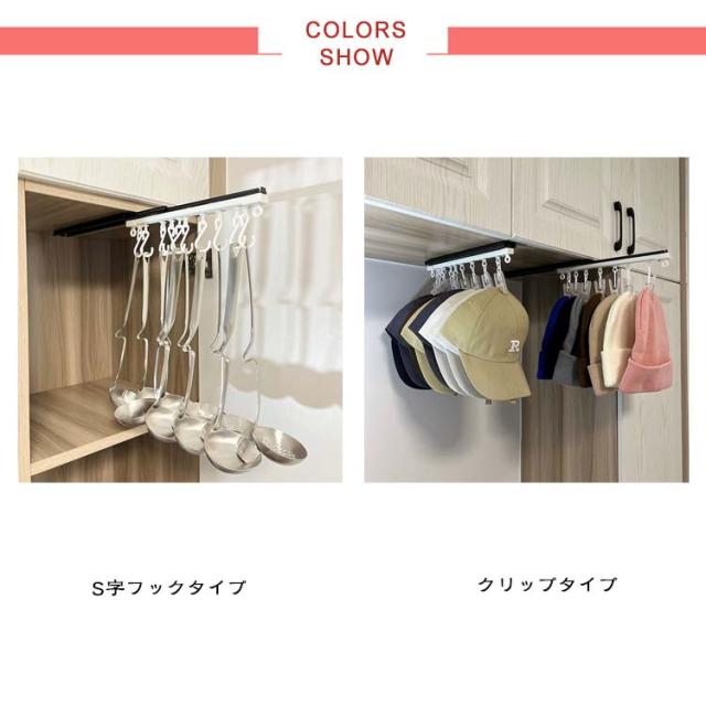 | 必要なときだけさっと引き出せるスライド式帽子ハンガー・フック。 クローゼットや壁面に取り付けるだけで、野球帽や帽子を簡単に整理できるだけでなく、下着や靴下、小物などの収納に便利な多機能ラック。 スライド式なので、帽子の出し入れが簡単で、クローゼットや押入れ、棚などに簡単に装着可能の粘着タイプも嬉しいポイント。 クリップ付きとS字フック付きの2タイプ展開、寝室だけでなく、キッチンツールホルダーとしても活躍できる多機能ホルダー。 粘着タイプだから取り付けも簡単で、冷蔵庫の左右どちらにも対応しています。普段は冷蔵庫横のスペースに見えないように隠しておくことができるから、生活感を隠しながら省スペースに収納できる便利な収納グッズ。 | |