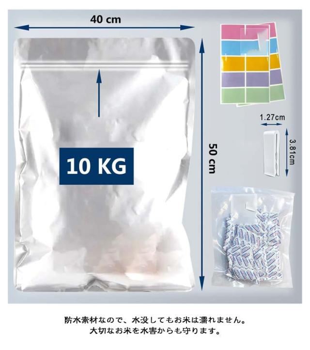 | サイズについての説明 | 5KG 35*40cm 10kg 40*50cm 23点セット内容:チャック付き袋10枚+脱酸素剤10個+ラベルシール2枚+スライダー1個 |