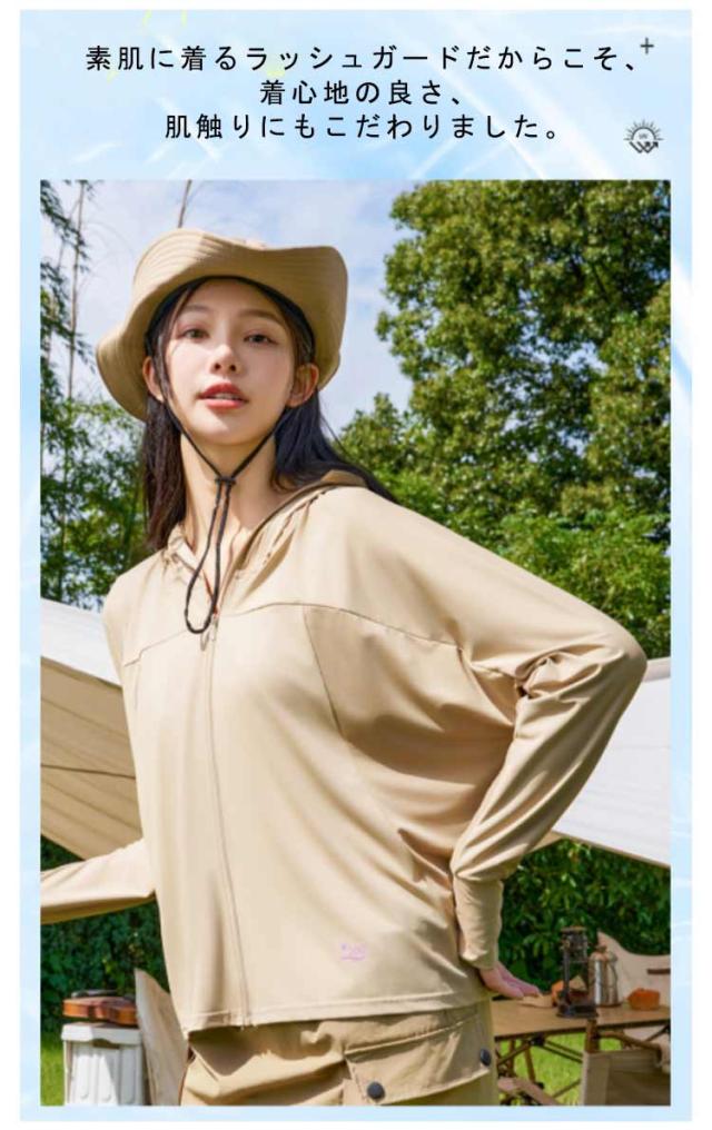 | 素肌に着るラッシュガードだからこそ、着心地の良さ、肌触りにもこだわりました。 接触冷感素材は軽量で柔らかく、放熱性が良いのが特徴です。 指付きアームカバー、フェイスカバーのデザイン、手の甲、顔の日焼け止めについても非常に重視しており、全面的な日焼け止め対策に力を注いでいます。 また、UVカットウェアは小さくてコンパクトで型崩れしないため、バッグに簡単に入れることができ、持ち運びに便利です。 ビーチだけでなく、アウトドアキャンプ、通勤、日常の外出、旅行でも着用していただけます。 | |