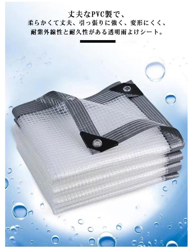 | 丈夫なPVC製で、柔らかくて丈夫、引っ張りに強く、変形にくく、耐紫外線性と耐久性がある透明雨よけシート。 ロープなどで吊るしたり、バンドで固定したり、いろんな使い方がありボタンホール付き、簡単に固定できます。 補強されたエッジ全体に沿って配置されて、風に抵抗する性は強いです。 自由に曲げたり折りたたんだりでき、小さな収納スペースしか占有しません。 温室、庭、芝生、パーゴラ、屋根、パティオ、中庭、ペット、プール、農場、キャンプ、車、ボートなどで使用できます。 | |