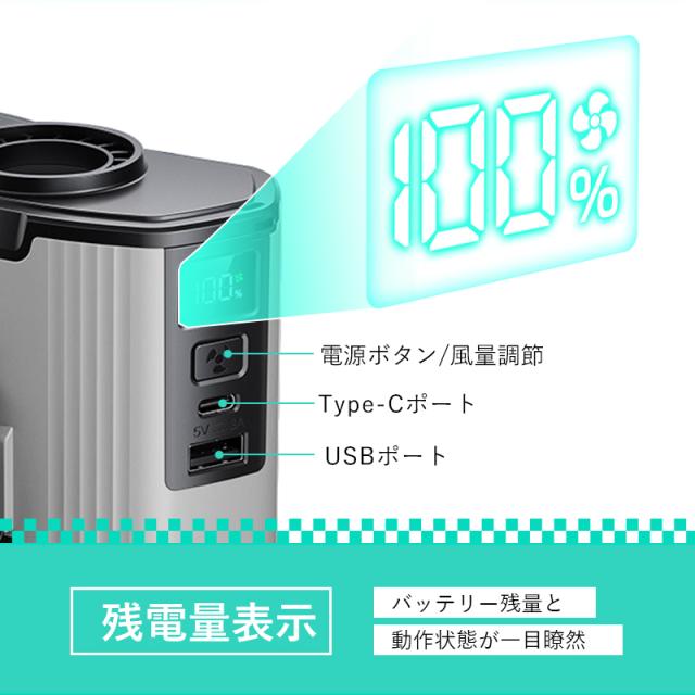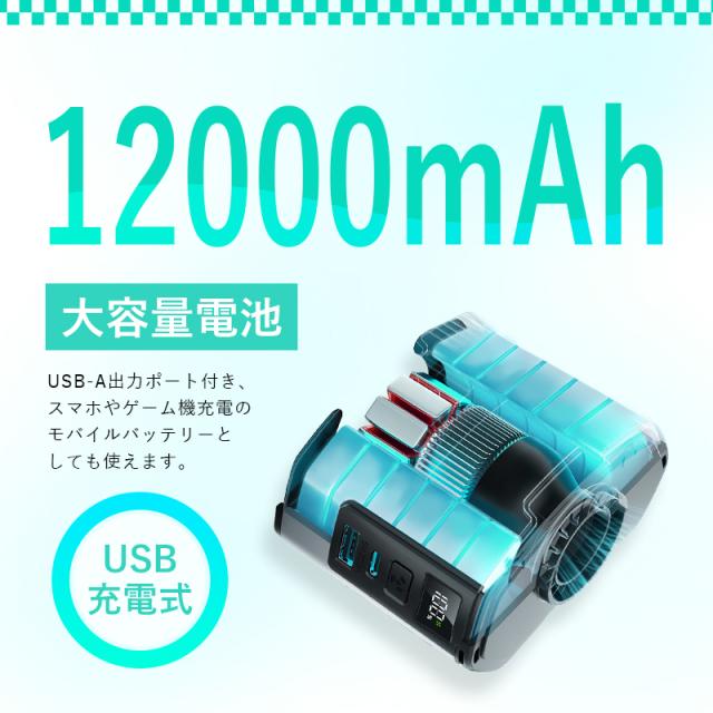 12000mAhの大容量充電式バッテリーが内蔵されており、長時間の稼働をサポートし、涼しい風を長時間楽しむことができます。モバイルバッテリーとしても使えます。