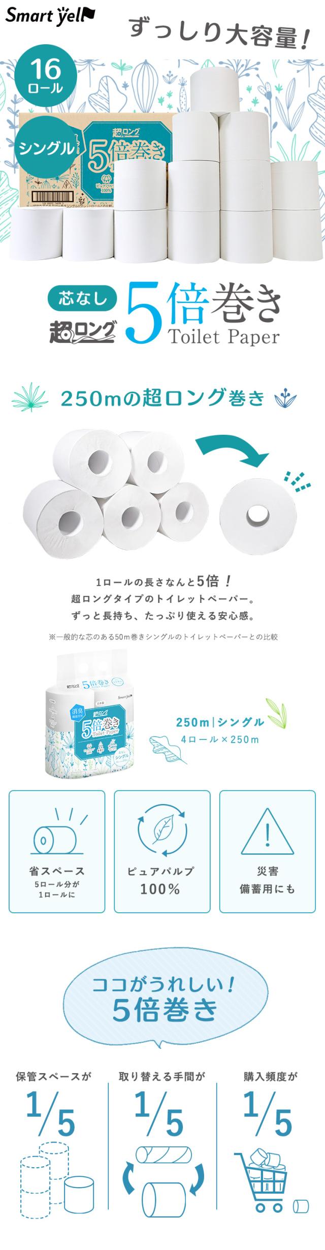 【実質2,587円!35%ポイント還元で 3/16 9:59まで】トイレットペーパー シングル 5倍巻き 芯なしパルプトイレットロール 250m4RS×4P シングル 5倍巻き 芯なし アイリスプラザ スマートエール パルプ 250m トイレットロール FSC認証 ロング 長持ち 16ロール