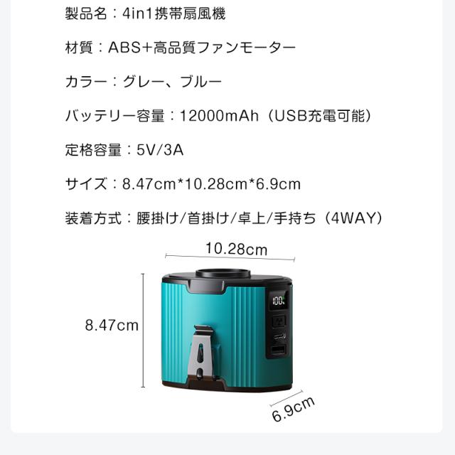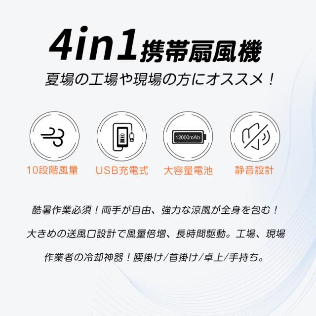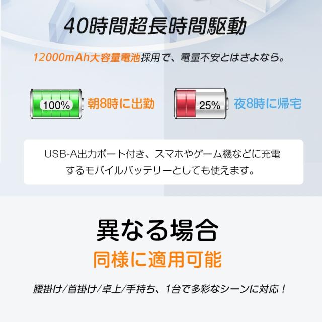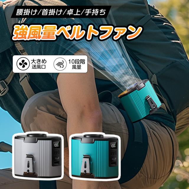 ベルトファン 多機能扇風機 腰掛け扇風機 クリップファン 携帯扇風機 ハンディファン 12000mAh大容量 モバイルバッテリー機能付き iPhone16充電 服の中に送風 上部送風 10段階風量 強力 ストラップ付 LED表示 コンパクト 熱中症対策グッズ 【PL保険加入済み製品・安心】