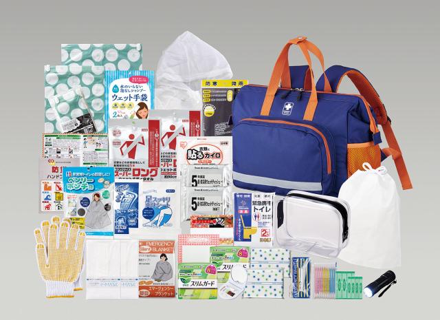 セット内容:避難用リュック、ホイッスル、9光ライト、レインコート、携帯トイレ(大小兼用)2P、ウェットティッシュ(20枚)×2、静音エマージェンシーブランケット、生理用ナプキン(8入)×2、シャンプー手袋、ウェットボディタオル×2、簡易ポンチョ、衣類圧縮袋(大小セット)、マスク×2、スクエアポーチ、ポケットティッシュ×2、防災ハンドブック、足スッキリ爽快シート(4枚入)、コットンパフ、あぶらとり紙、軍手、綿棒10P、エイトバン(大小×各2)、熱冷却シート(2枚入)、衣類収納巾着袋、ソーイングセット、使い捨てカイロ