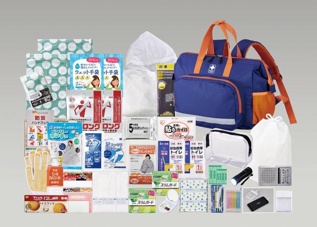 セット内容:避難用リュック、ホイッスル、9光ライト、レインコート、AM/FMポータブルラジオ、モバイルチャージャー(乾電池式)、携帯トイレ(大小兼用)1P×2、ウェットティッシュ(20枚)、静音エマージェンシーブランケット、生理用ナプキン(8入)×2、シャンプー手袋×2、ウェットボディタオル×2、簡易ポンチョ、スクエアポーチ、防災ハンドブック、使い捨てカイロ、衣類圧縮袋(大小セット)、マスク×2、備蓄用飲料水500?、ライスクッキー、足スッキリ爽快シート(4枚入)、コットンパフ、あぶらとり紙、軍手、綿棒10P、エイトバン(大小×各2)、熱冷却シート(2枚入)、衣類収納巾着袋、ソーイングセット、ポケットティッシュ×2