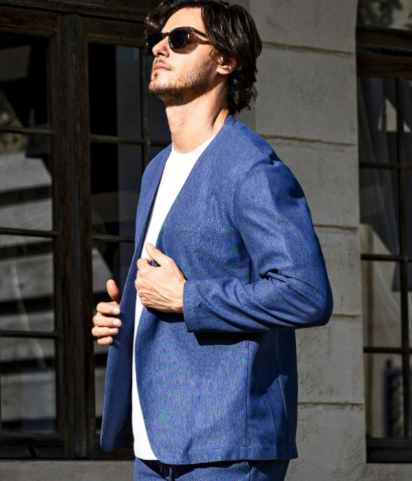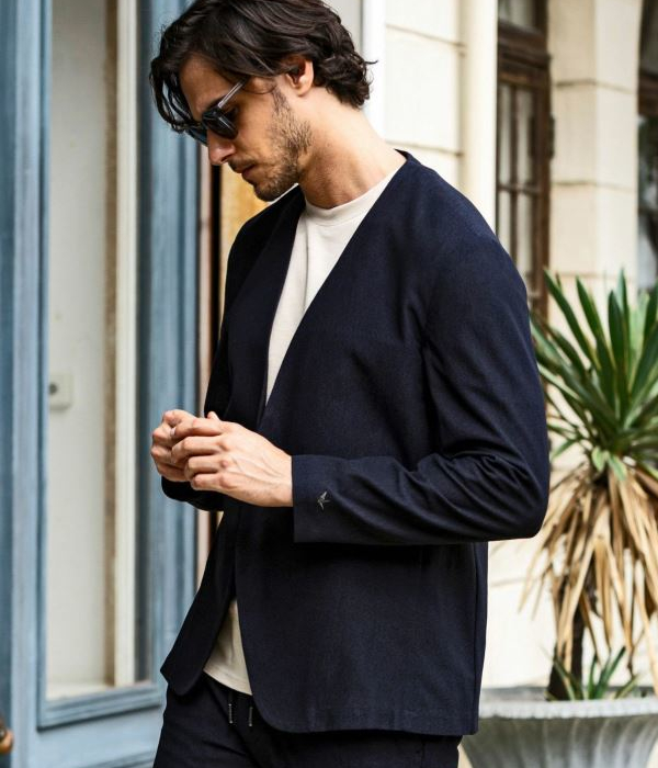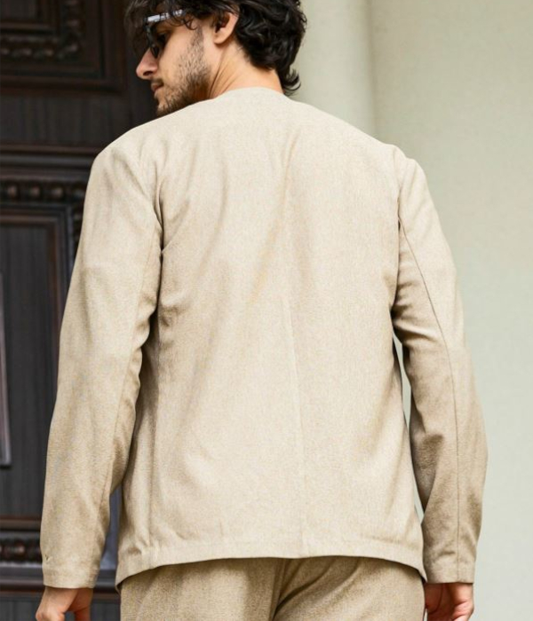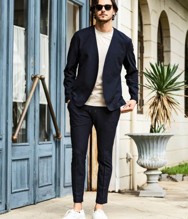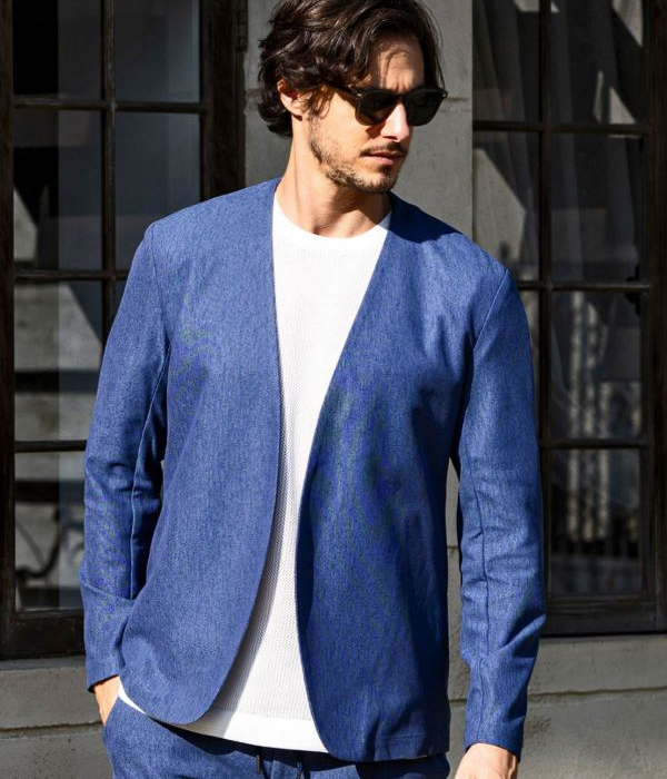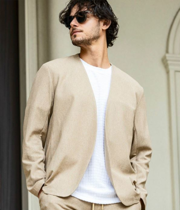 トレンドの襟無しジャケットなのでかっちりしすぎない大人の余裕を演出します。