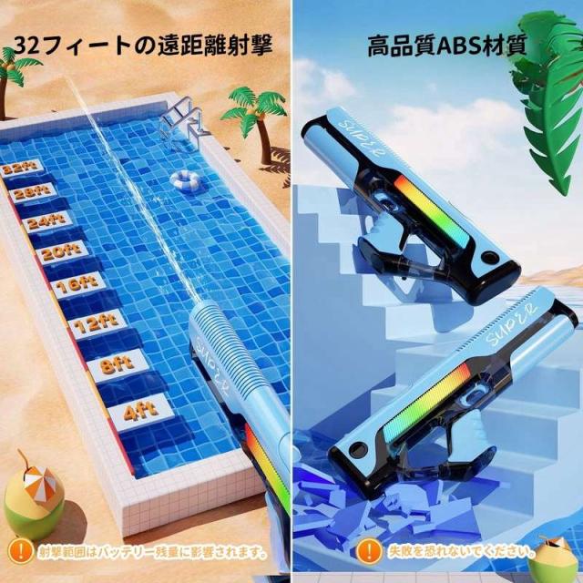 【光る水鉄砲】クールな見た目でかっこよく、新感覚の水遊びが楽しめるウォーターガンです。子供から大人まで楽しめるため、親子で一緒に遊べるおすすめの玩具です。ボディ側面にはLEDライトが装備されています!夜間に使うと、光る水鉄砲で真夏の夜を盛り上げよう!水合戦、バーベキュー、家族のイベント、プール、ビーチ、海水浴や水のパーティーなどのシーンに最適です。