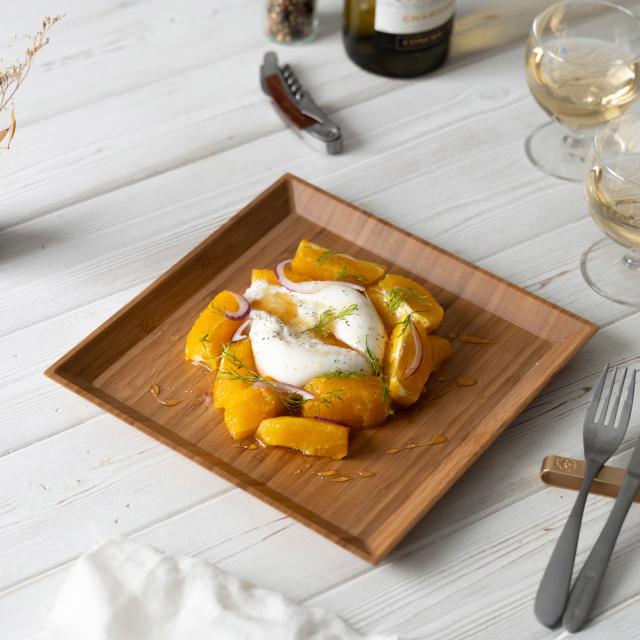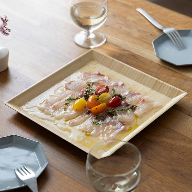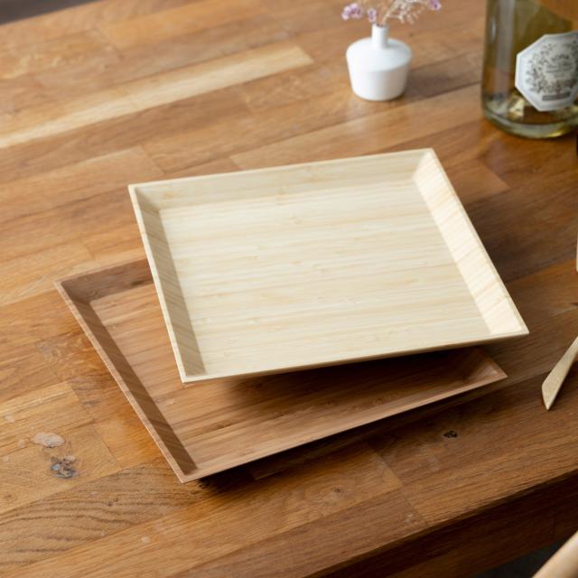 直線的でシャープな印象のディナープレート スクエアの2枚セット。パスタやリゾットなどのメインや、サラダ用としてはもちろん、おしゃれに盛り付けできるデザート皿としてもおすすめ。飽きのこないシンプルなシルエットと、竹ならではの風合い、さまざまな料理にフィットします。 硬さを感じやすい陶器やガラス製食器とくらべ、見た目も質感もやわらかな天然素材食器。「しっくりとなじむ手ざわり」は天然素材ならでは。職人によって程よい薄さに削りだされる食器は、盛り付ける料理を邪魔することなく、本来の味わいを引き立てます。「うつわ」は味の印象を大きく左右するほどの大事な要素。RIVERETのナチュラル食器だからこそ楽しめる味わいやシーンを、ぜひお楽しみください。カラーは天然素材本来の色味をいかした高級感のあるホワイトと、高温で燻すことで色を変化させた趣のある色合いのブラウンをご用意。