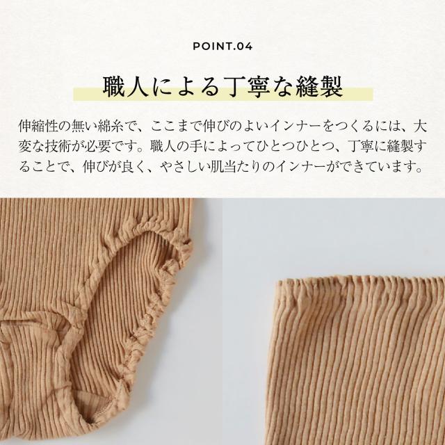 深めの股上と、やわらかなゴムでストレスフリーな履き心地。どんな体調のときでも、お尻とお腹をやさしく包んでくれます。足回りも締め付けにくく、血行を阻害しにくいつくりです。