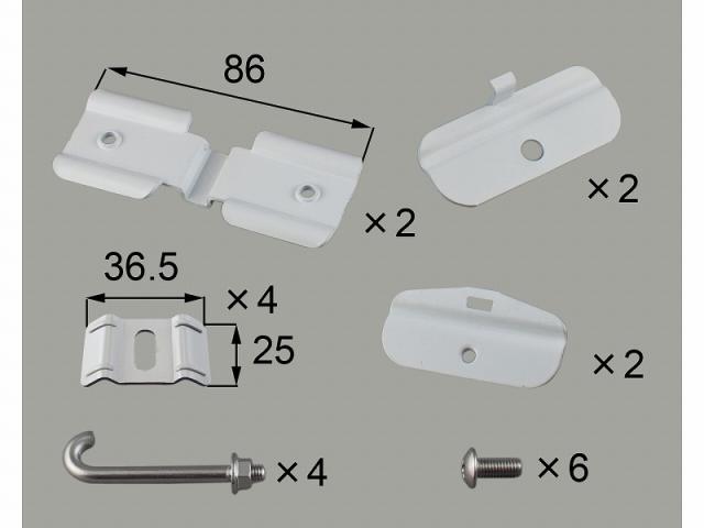 ●備考: 接続金具(2)、押え金具(4)、固定フック(4)、パネル止め金具1(2)、パネル止め金具2(2)、トラス小ねじM5x12(6)、フランジナットM5xφ11(3)